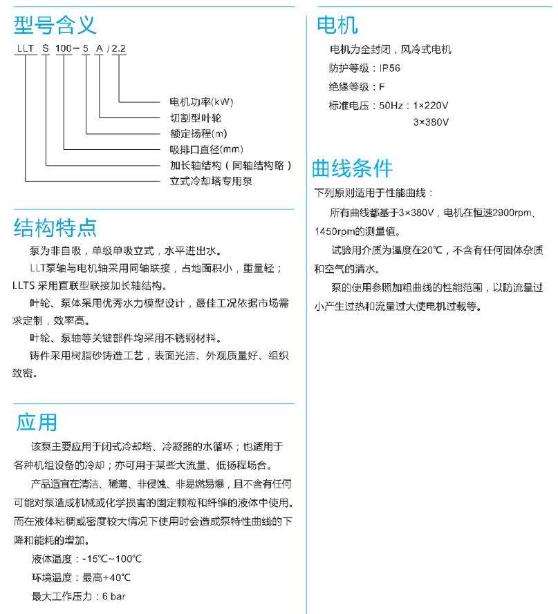 LLT、LLTS泵為非自吸,單級單吸立式,水平進出水。LLT泵軸與電機軸采用同軸聯接,占地面積小,重量輕;LLTS采用直聯型聯接加長軸結構。,葉輪、泵體采用優秀水力模型設計,依據市場需求定制,效率高。