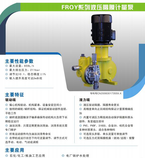 南方FROY系列液壓隔膜計量泵:偏心機構驅動,機構緊湊,設備安裝空間小。獨特的蝸輪蝸桿結構,保證機械驅動部件連續、平穩工作。
